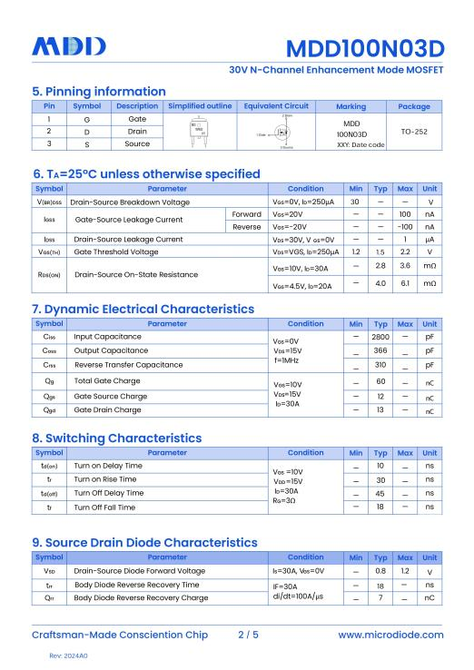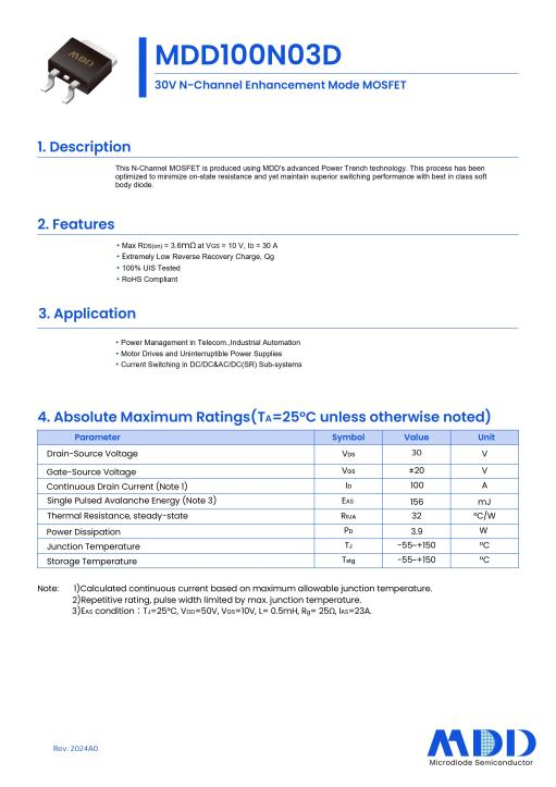 MDD100N03D的最大亮點在于其極低的導(dǎo)通電阻(RDS(on))。在VGS=10 V、ID=30 A的條件下,RDS(on)僅為3.6mΩ,這意味著在電流通過時,能量損耗被降至最低,尤其在高頻開關(guān)場景中(如直流/直流轉(zhuǎn)換),可顯著減少發(fā)熱,提升系統(tǒng)整體效率。