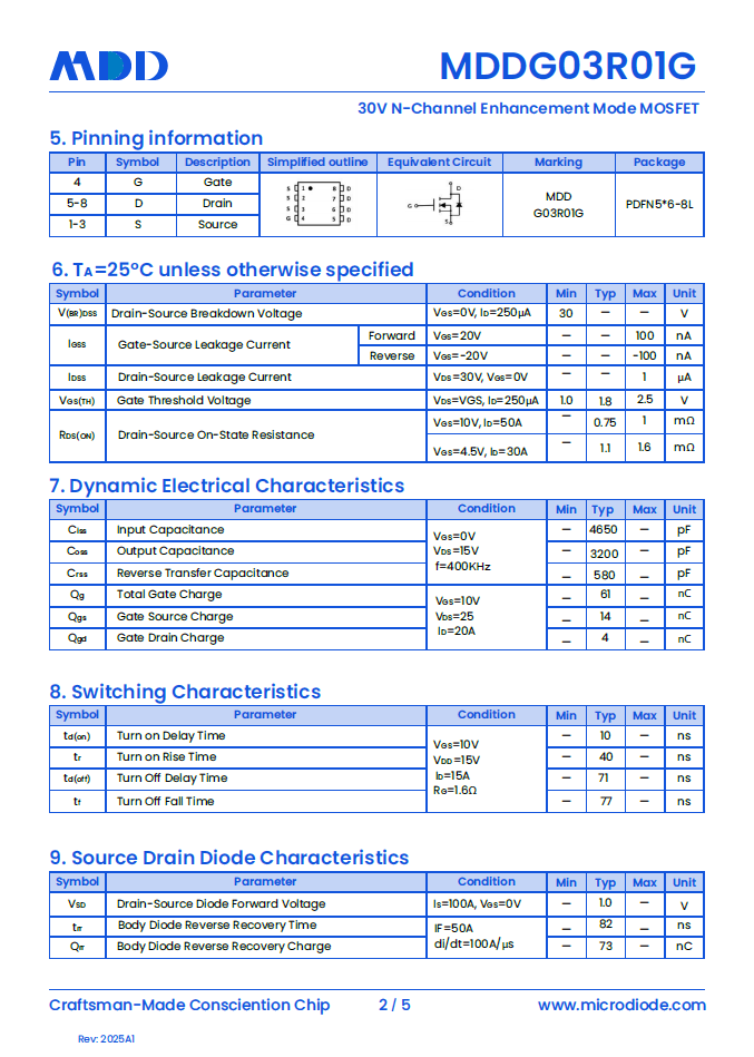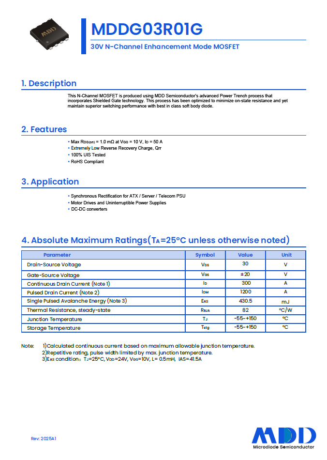 MDDG03R01G在柵源電壓VGS=10V、漏極電流ID=50A的條件下,其最大導(dǎo)通電阻RDS(on)僅為1.0mΩ。如此低的導(dǎo)通電阻,能夠有效降低器件在工作過程中的功率損耗,提高系統(tǒng)的整體效率。
