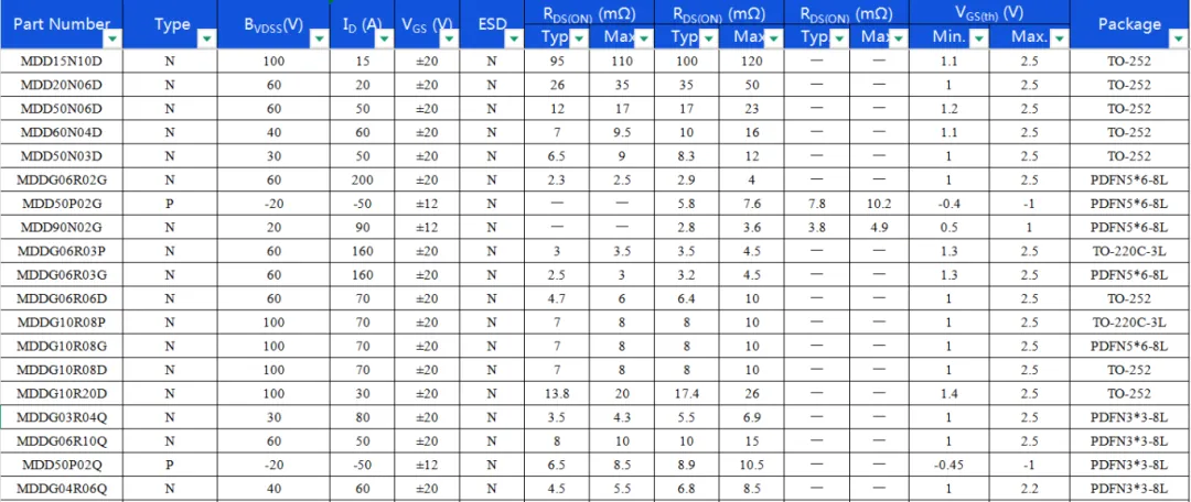 除此之外,MDD新推出的低壓大電流系列MOS針對(duì)不同的應(yīng)用場景,推出不同的型號(hào),以滿足各行業(yè)匹配需求。